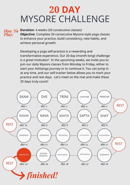 Our 20 day (month-long) challenge is a great motivator! In the upcoming weeks, we invite you to join our daily Mysore classes from Monday to Friday, either to start your Ashtanga journey or to continue it.