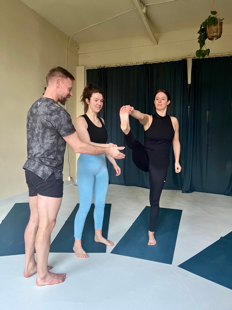 Hands-On teaching can serve many useful purposes, including providing more stability, comfort, and precision in a pose. Sometimes the assists can make the pose easier, but other times the teacher knows how to make the pose harder…